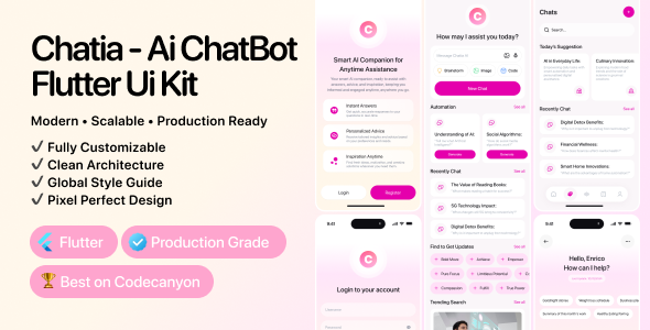 Chatia – AI Chatbot Mobile App (Flutter) Chatia is a premium, production-ready AI Chatbot Mobile App UI built entirely with Flutter. It is engineered as a scalable and maintainable Flutter application, ideal for startups, SaaS platforms, AI tools, and client projects....